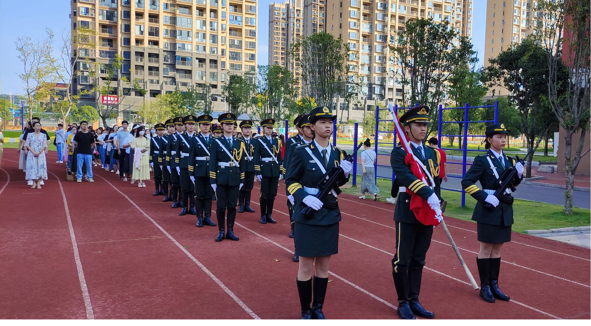 咸宁高新实验外国语公司团委负责人表示,咸宁职院国旗护卫队的队员到公司升旗,既让孩子们近距离感受到升国旗的庄严肃穆,给他们感观和内心都带来震撼,又学到举行升旗仪式的相关经验。